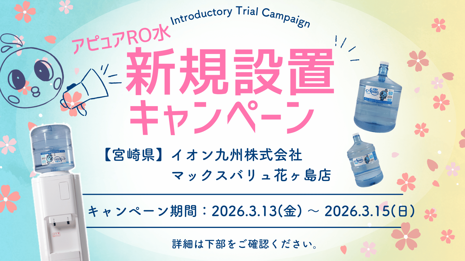 ![[宮崎県]アピュアキャンペーン☆[ 3/13 ~ 3/15] | 「アピュアRO水」の自動販売機 - 水と心でくらしの笑顔づくり](https://apure-smile.com/renew/wp-content/themes/yps/images/common/header_logo.gif)